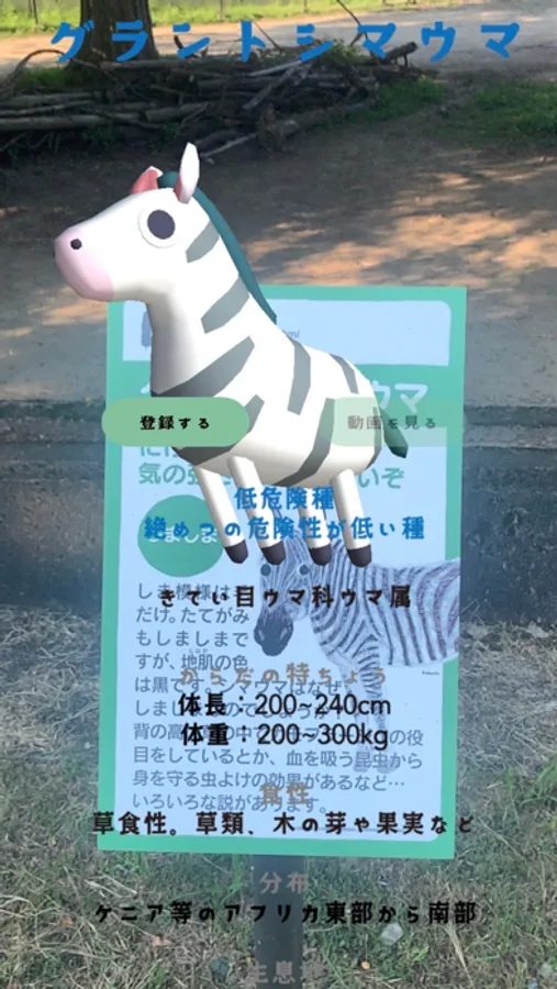 園内に設置されている各動物の看板をアプリ内のカメラで読み込むことにより、その動物のモデルと生態の説明文がARで表示されます。『登録する』のボタンを押すことにより、図鑑に登録されます。動物たちの図鑑を集めていきましょう!