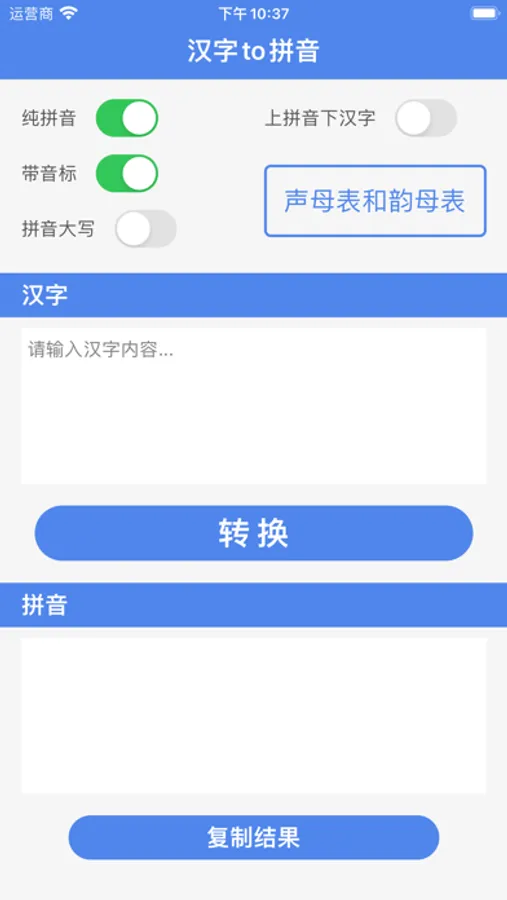 汉字转拼音是一款支持字典辞典、成语词典、诗词、绕口令等大段文字转换成拼音,方便人们学习的工具app。是您远离生僻字、学好一口标准普通话的好帮手。该软件支持多种转换模式,可以单独将汉字转换成纯拼音,也可以将拼音放在汉字的上边,方便对照;同时支持大图查看。