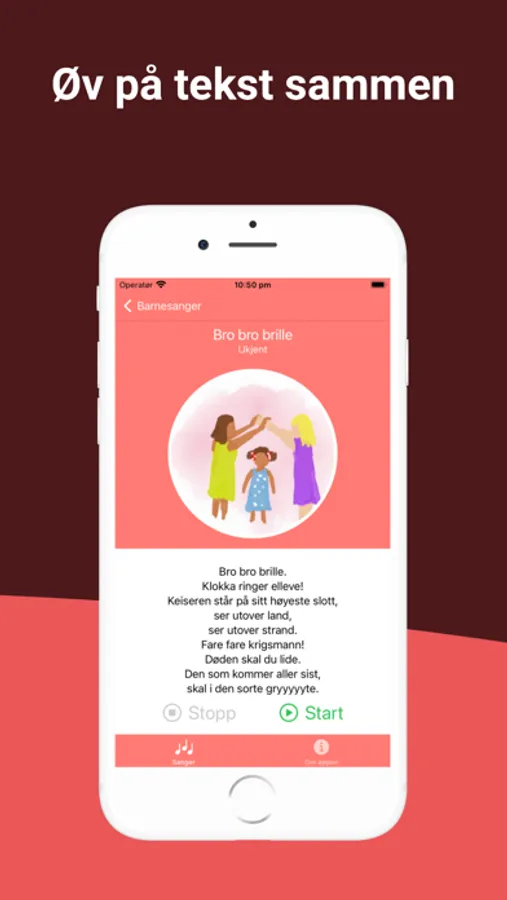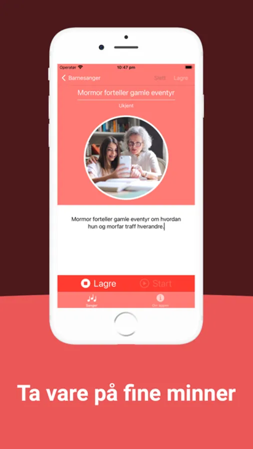 Appen gir deg mulighet til å ta opp lyd og legge ved bilder og tekst til lyden. I tillegg inneholder den et knippe norske barnesanger fra før, med tekst, bilde og lyd som dere kan høre på sammen eller lære å synge sammen. Syng, lek og ta dere en trall sammen! Ta med appen til besteforeldre, barnehagen eller på skolen. Spill inn sanger sammen og ta vare på minnene. :)
