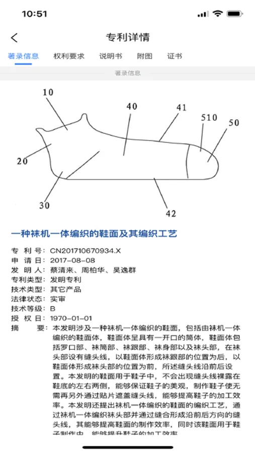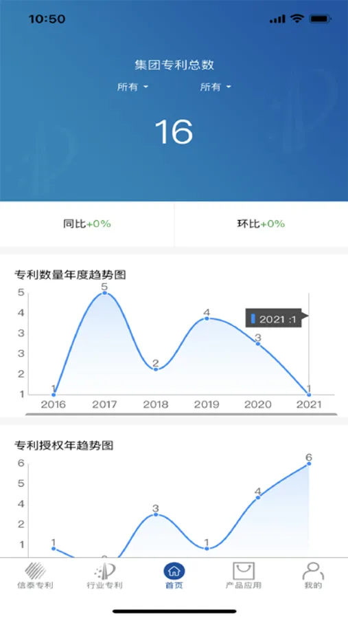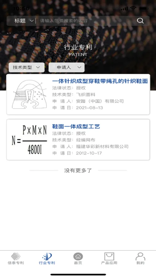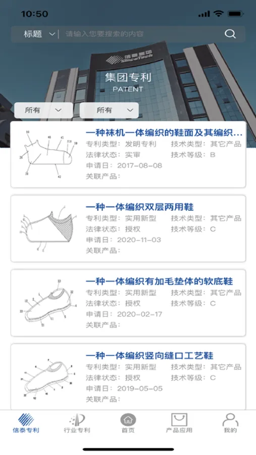 该应用主要包含五个模块,集团专利:主要是信泰集团内部的专利信息汇总;行业专利:纺织行业相关专利信息汇总;数据分析:主要针对信泰集团近几年的专利信息统计,并以图表方式呈现;产品应用:统计目前集团的相对应的产品以及所关联的专利;我的:包含基本的个人信息修改、关于我们(app操作手册、以及隐私政策),在线检查更新