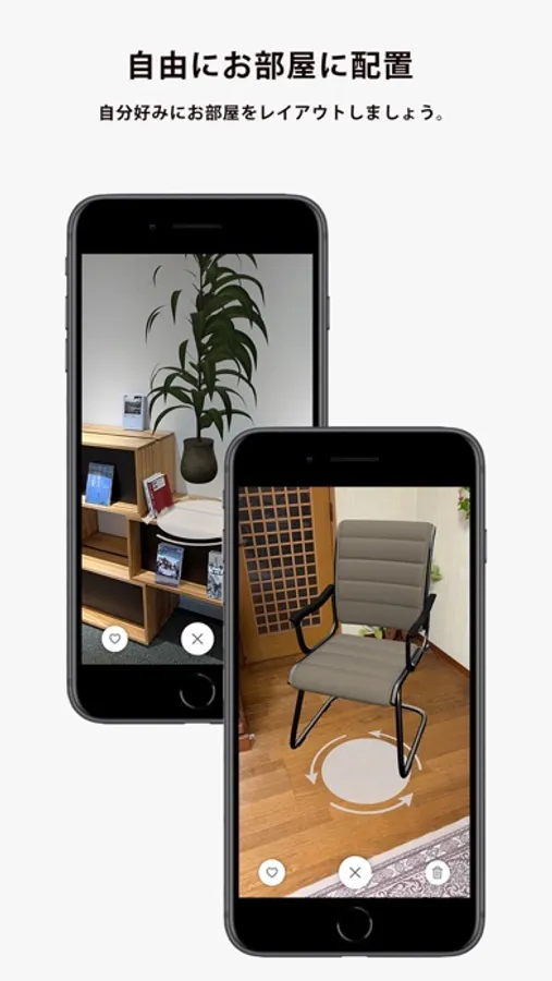お部屋の配置したい箇所にiPhoneをかざしてボタンをワンタッチするだけ。移動、削除もワンタッチで納得いくまで何度もやり直しができます。