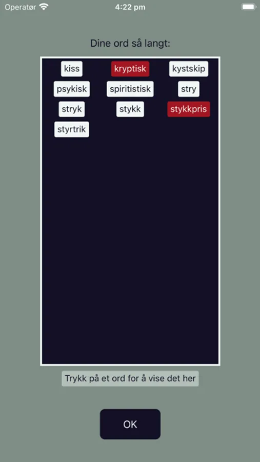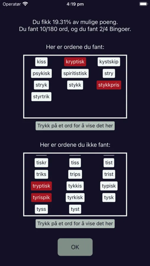 Når du føler deg ferdig med en runde får du se en fasit, med god oversikt over alle ordene du ikke fant.
