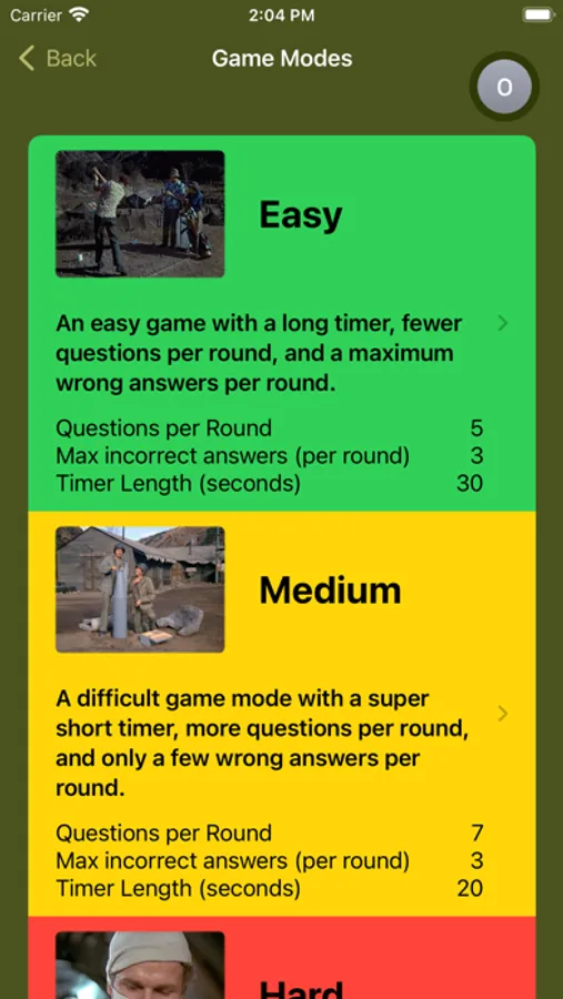 There are four game modes: Easy, Medium, Hard, and R&R. Each mode has a different timer length, number of questions per round, and a different maximum number of incorrect answers.
