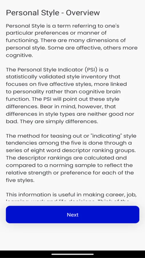 The Personal Style Indicator (PSI) is a statistically validated style inventory that focuses on five affective styles, more linked to personality rather than cognitive brain function. The PSI will point out these style differences. Bear in mind, however, that differences in style types is neither good nor bad. They are simply differences.