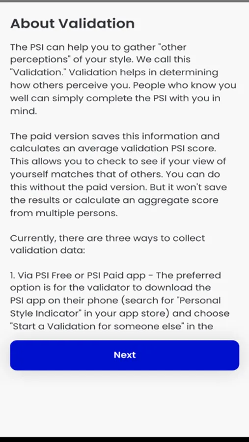 In addition, the PSI can help you to gather "other perceptions" of your style. We call this "Validation." Validation helps in determining how others perceive you. People who know you well can simply complete the PSI with you in mind. This allows you to check to see if your view of yourself matches that of others.