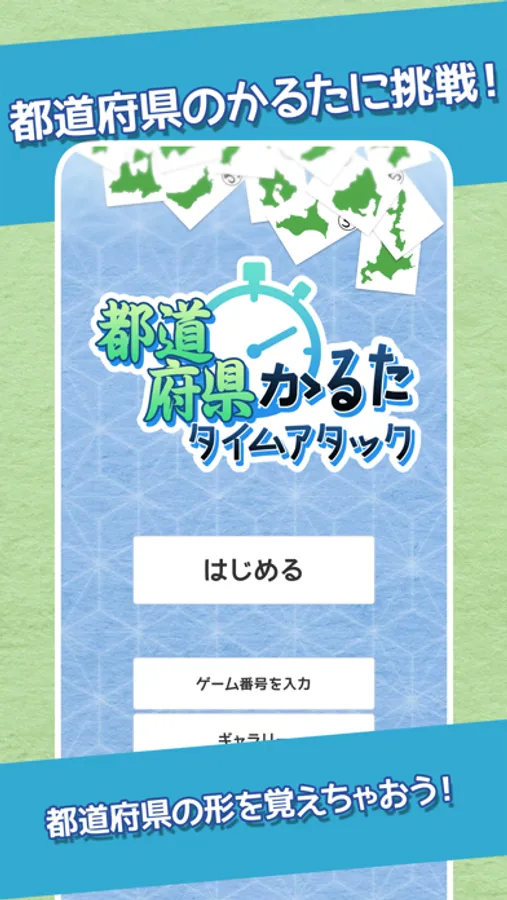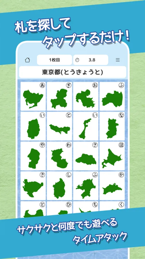 都道府県かるたです。出題される都道府県の名前を見て、対応する取り札をできるだけ早くタップすることで進めていきます。