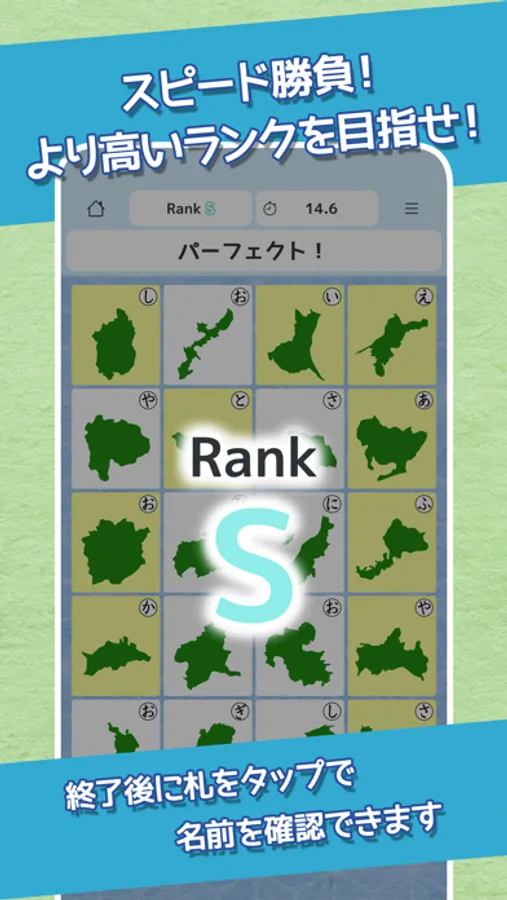 「都道府県かるたタイムアタックPro」では、取り札に名前の最初の文字が書いてない「上級レベル」と、さらに取り札の都道府県の形が半分くらい隠れている「超上級レベル」の2つのモードが追加されています。ぜひ挑戦してみてください。