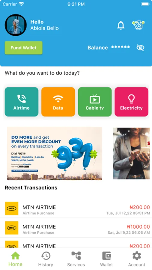 With 931 Mobile App, you can make transfers to other Wallets and Bank accounts. We offer a range of services ranging from airtime, data subscriptions, electricity, and cable tv (GoTV, DStv, Startimes) subscriptions.