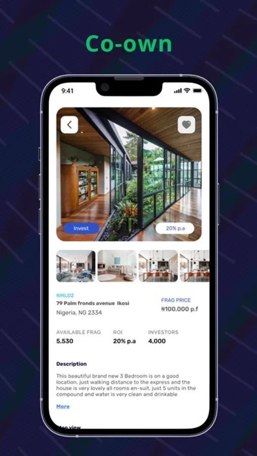 We additionally offer you the ability to co-own a land or an apartment, which means mutually owning a real estate property of your choice with other people (your friend, family, or even a stranger). The income & expenses of the property are shared between you and other co-owners based on individual percentages contributed. You can become a legal land co-owner with as little as ₦1,000 via Fragvest online real estate store.