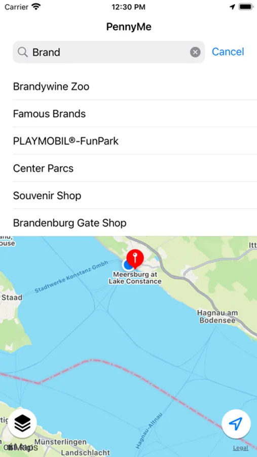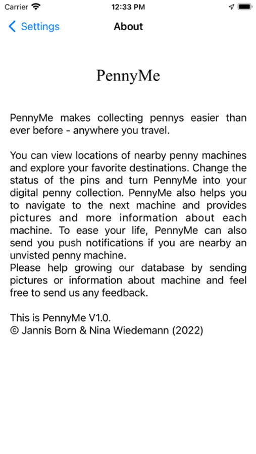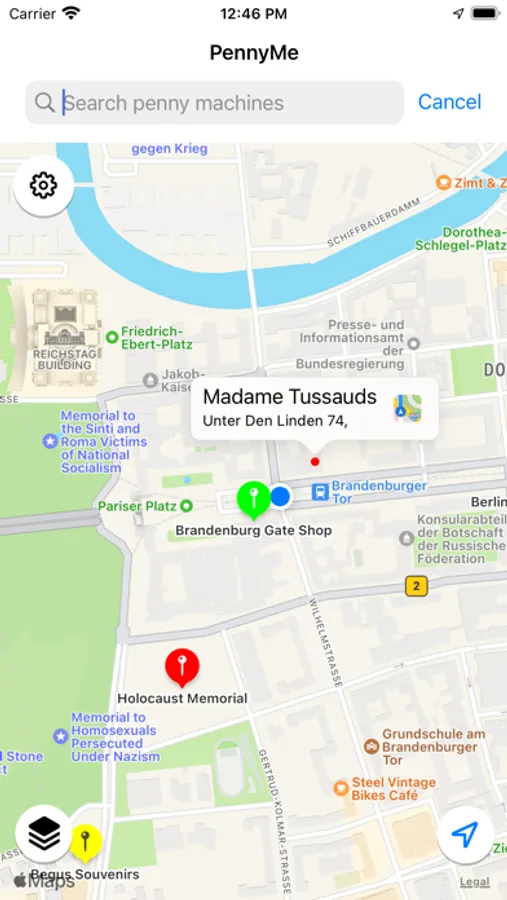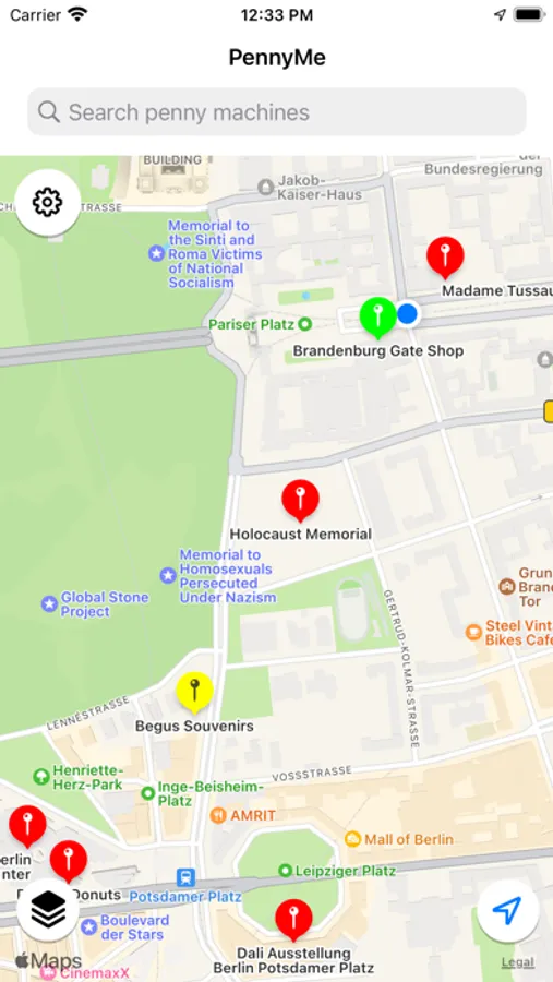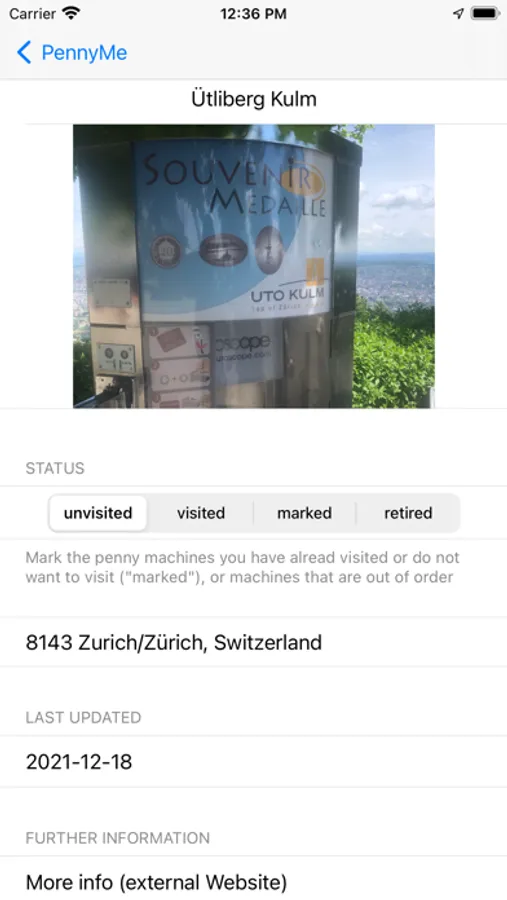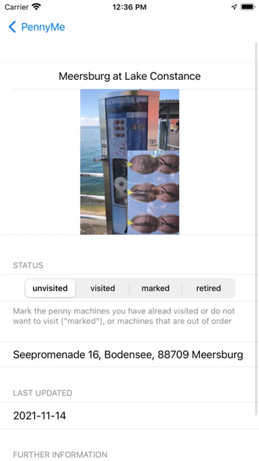 PennyMe displays all machines worldwide on a map and displays detailed information about a machine upon selection.