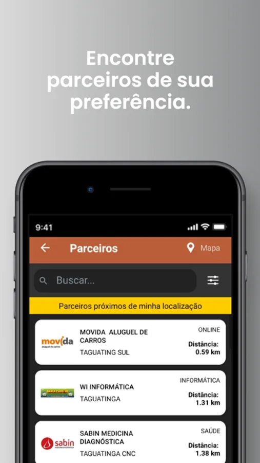 Busca de parceiros através do geolocalizador, filtragem personalizada para as buscas de empresas parceiras, acesso ao cartão virtual para utilizar os descontos, acesso a notícias e além do SAC para atendimento.