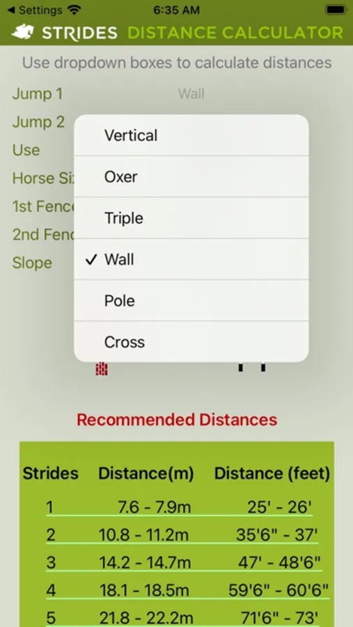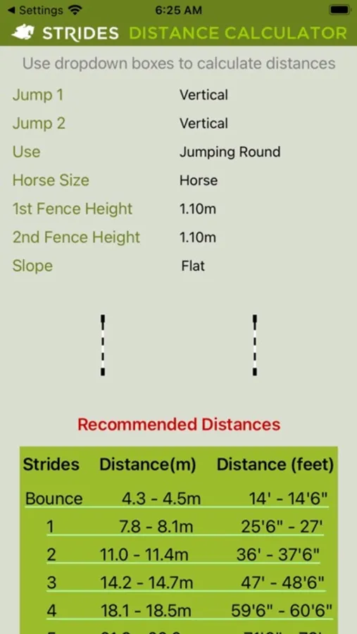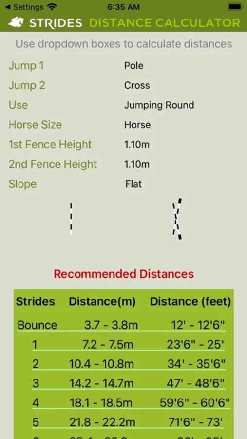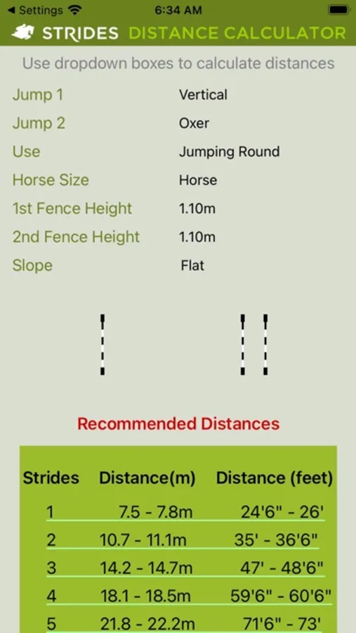 The best distance to set between any two equestrian jumping fences depends on many variables. Strides Distance Calculator calculates a set of customized distances between equestrian jumping fences according to jump type, use, horse size, jump heights and ground slope. These variables can be selected using drop boxes. Distances are then displayed in both metric meters and imperial feet.