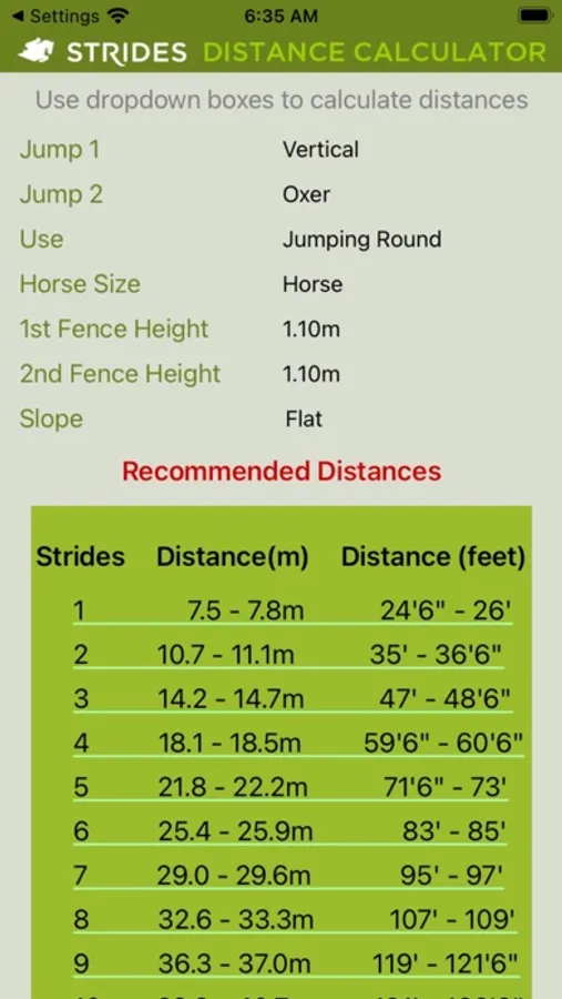 After each drop box selection is made the distances will then be recalculated. The distances are then displayed in a table with a minimum and maximum distances for a bounce, one stride and then up to nine strides. Each distance is displayed in metric meters and imperial feet, so no conversions are required.