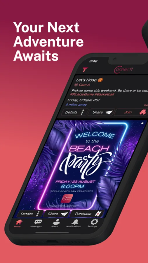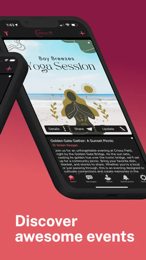 Connectt is the best way to find pickup games, parties, study groups, game nights, local events, and more. We curate social gatherings for you and present you with the activities you're most likely to enjoy. When you find something you'd like to do, join, message, and let loose!