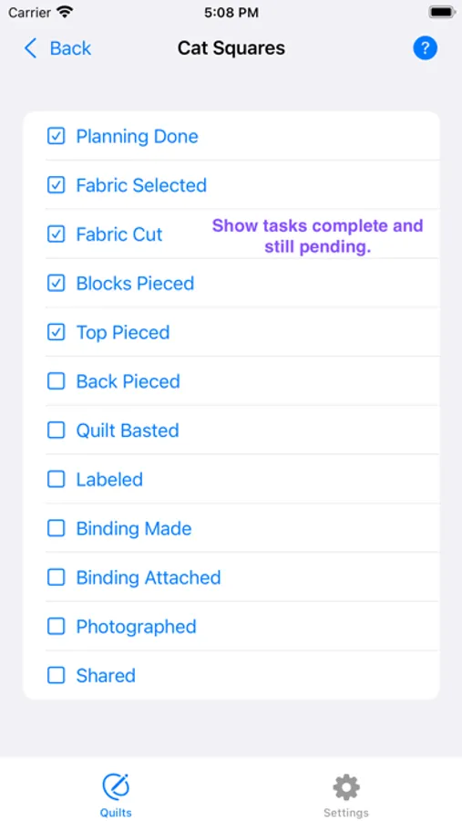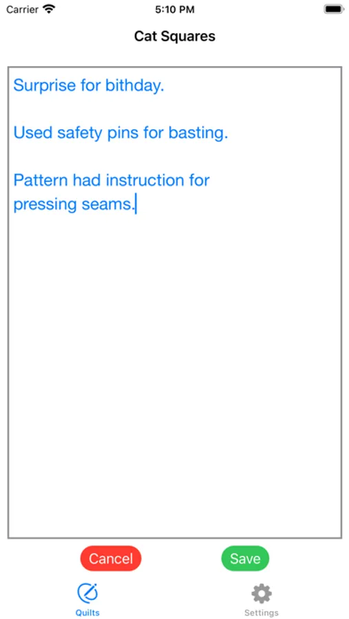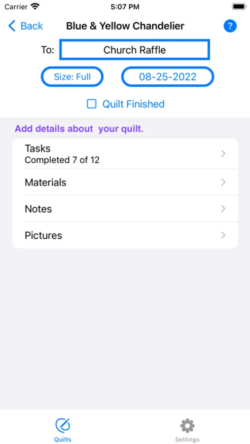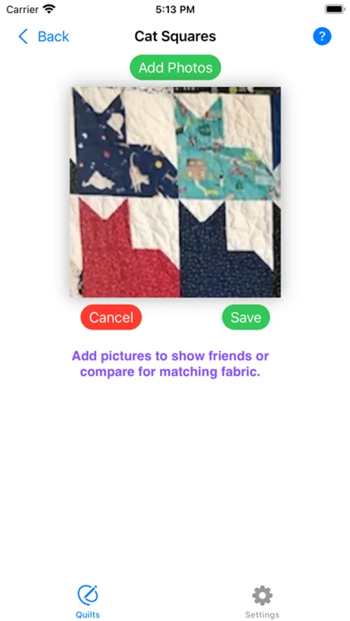 Your quilts are searchable by pattern name or who it was made for. Have past quilt information quickly available when you are buying new supplies. Show off a finished quilt pattern or document your progress with pictures.