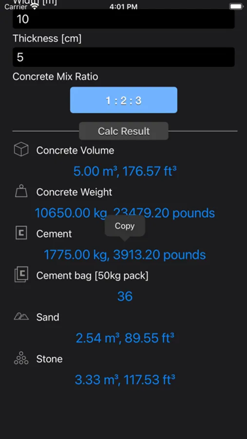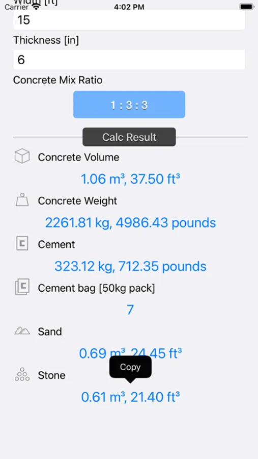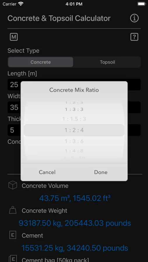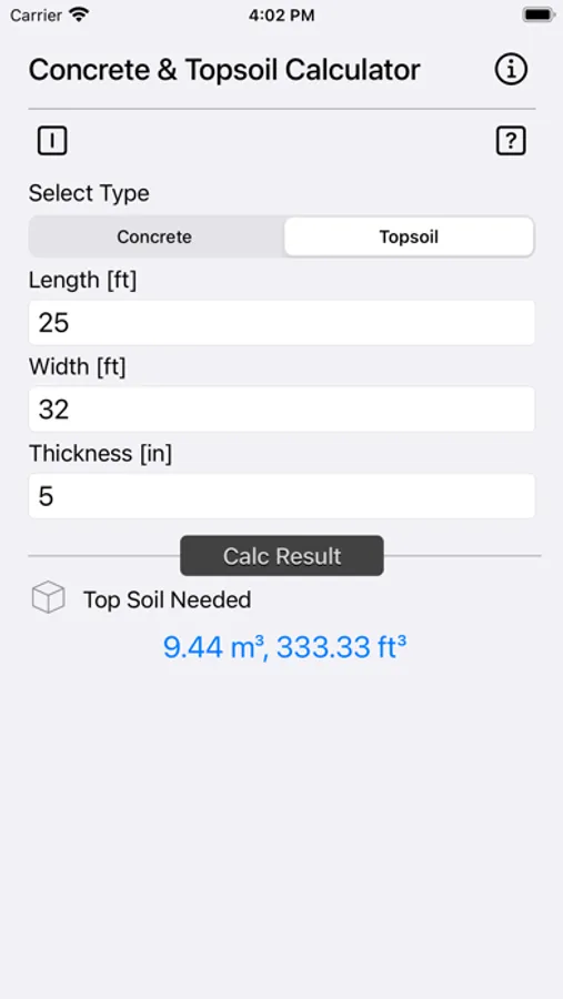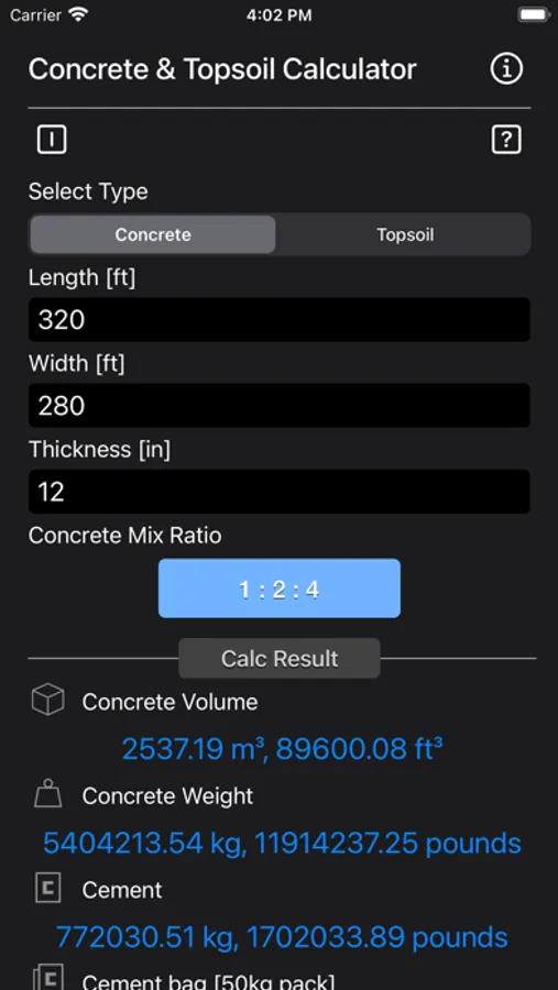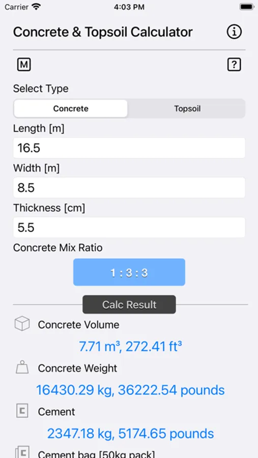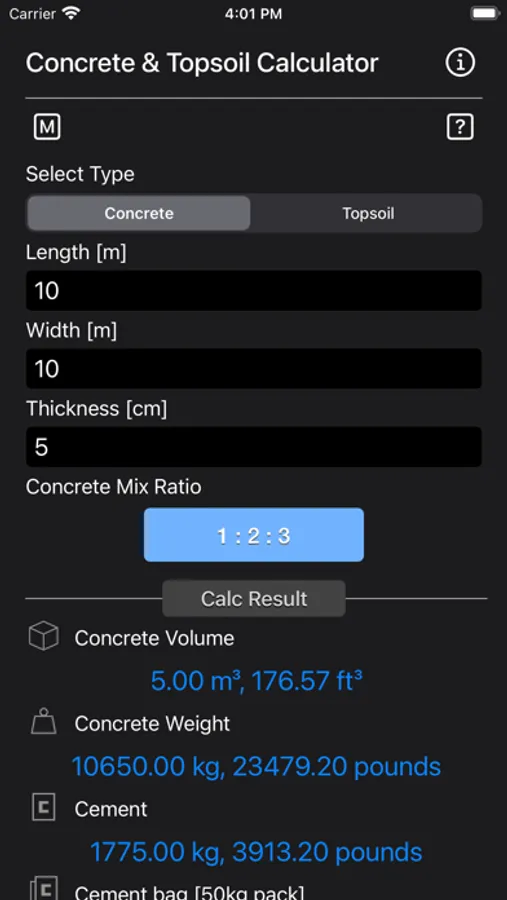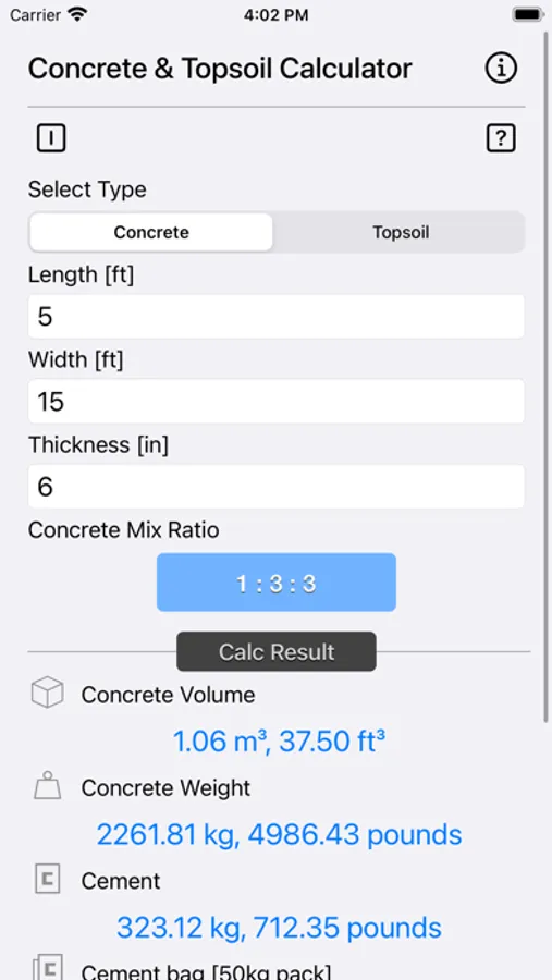 Concrete & Topsoil Calculator calculate construction material consumption viz., cement, sand, stone gravel. Once the quantities are determined, it is easy to estimate the cost of a concrete block, driveway, patio, yard or any other structure with the price prevailing in your area.
