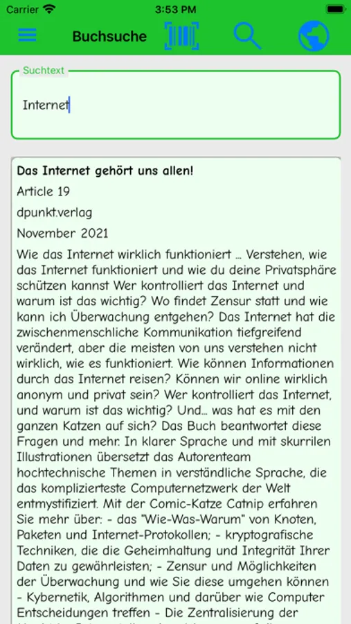 Zusätzlich gibt es eine integrierte Buchsuche (ISBN-Nummer oder Text) mit einem ISBN-Barcode-Leser.