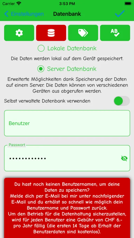 Die Daten können wahlweise lokal auf dem Gerät (Einzelgerät) oder auf einem Datenserver (erlaubt Geräteübergreifendes Zugreifen auf die Daten) gespeichert werden.