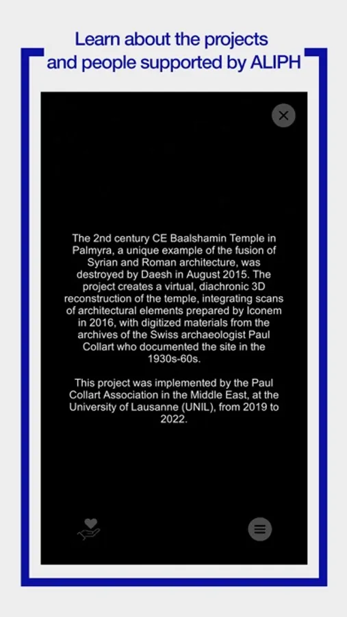 ALIPH AR is an augmented reality app that accompanies the photo exhibition “Protecting heritage to build peace” from the International alliance for the protection of heritage in conflict areas (ALIPH).