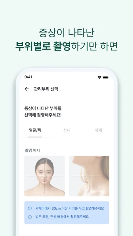 - 가이드라인에 따라 촬영하면 증상이 나타난 부위의 크기를 알 수 있어요