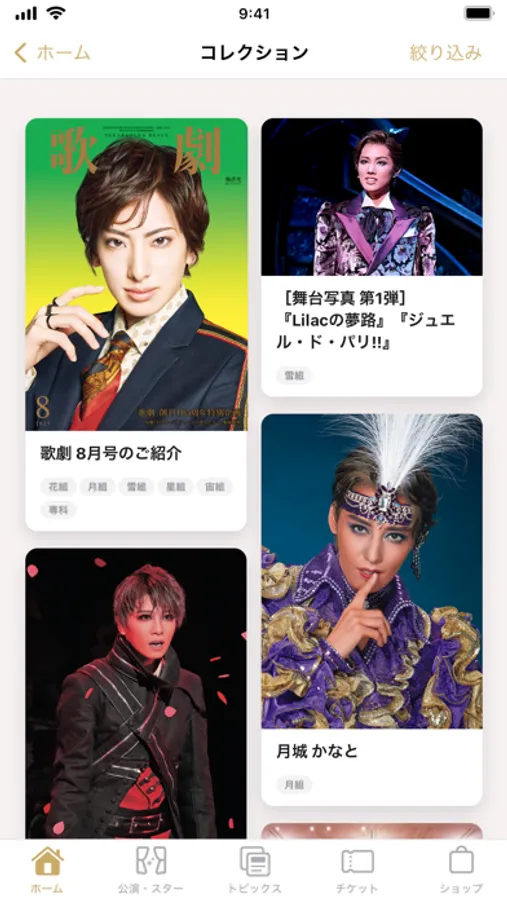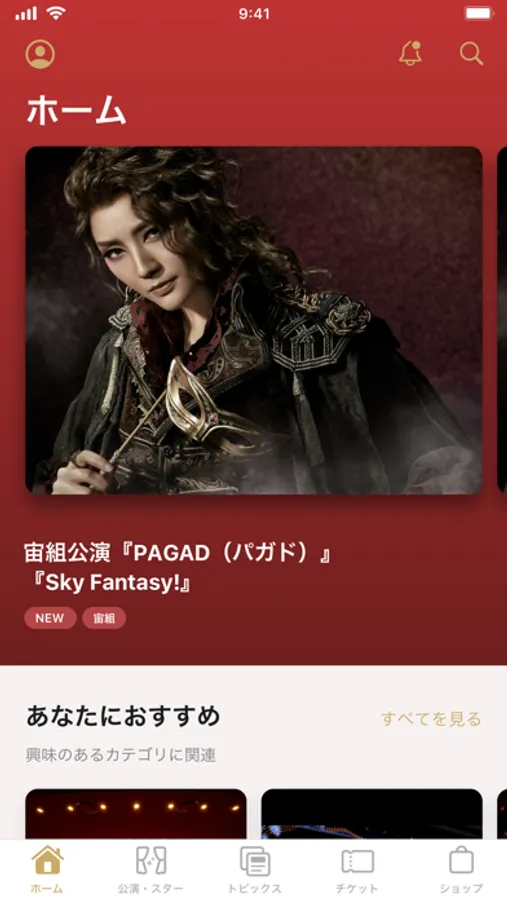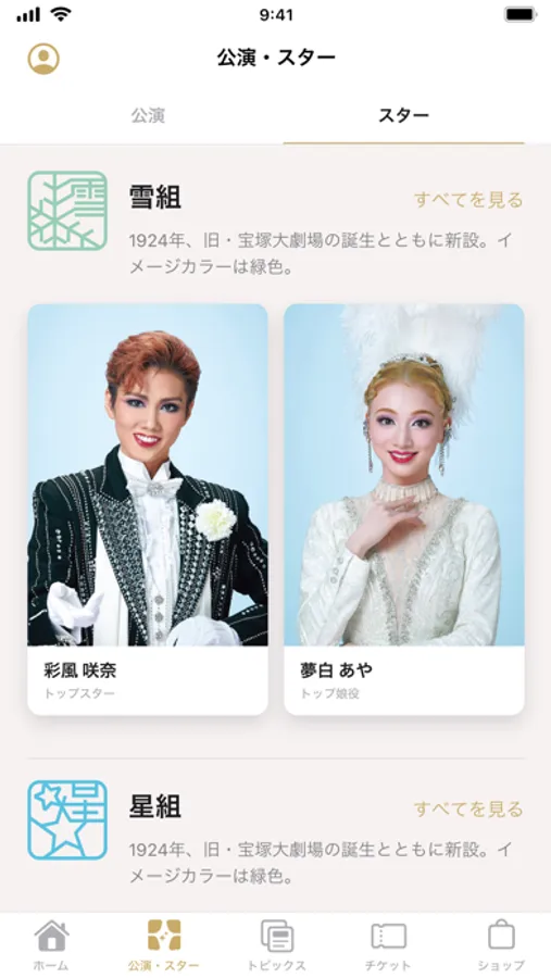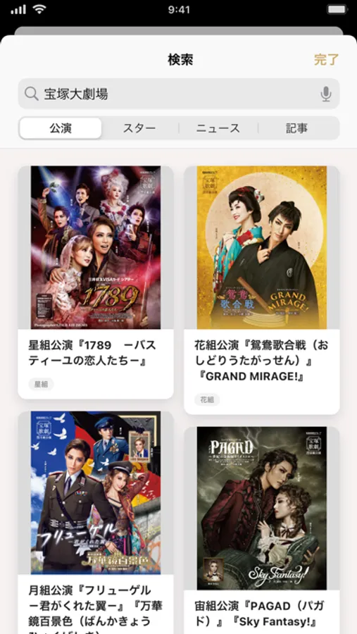 スッキリしたレイアウトで見やすく、タップできるカードやボタンが分かりやすいデザインです。気になったワードで検索すると、わずか数タップで公演やスターに関する情報が見つけられます。