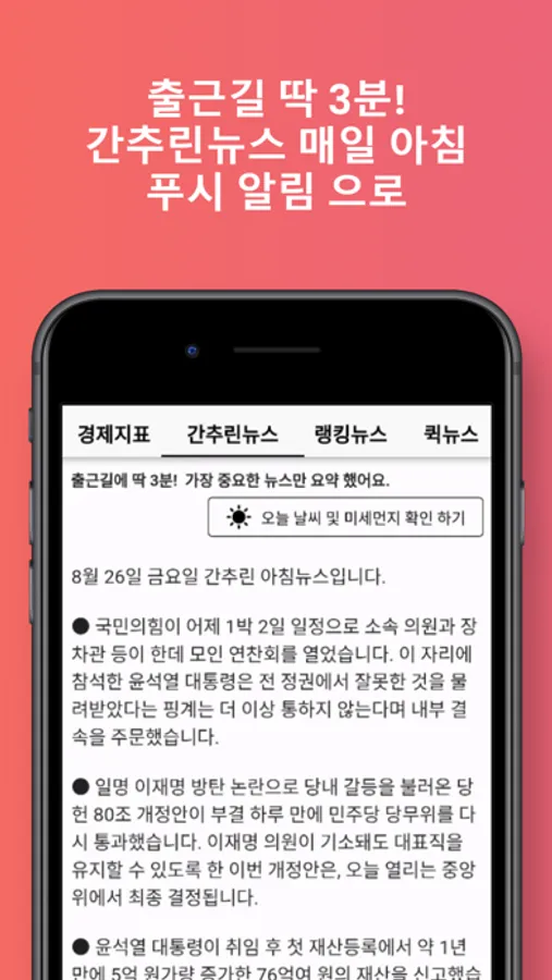 출근길에 딱 3분! 가장 중요한 뉴스만 요약해서 보여 드려요.