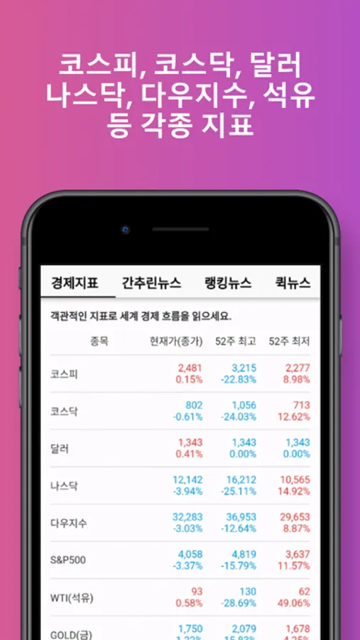 코스피, 나스닥, 국제유가, 금등 다양한 경제지표를 제공해요.