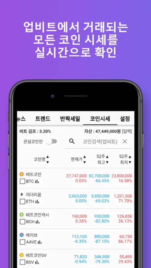 업비트 기준 모든 코인 시세를 쉽게 확인 할 수 있어요.