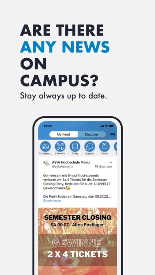Mainz Campus2Go is your team partner on campus, which is worth seeing and integrates perfectly into your daily study routine. In no time at all, you have all the important information about your studies with you, wherever you are. You'll be surprised how easy it is.
