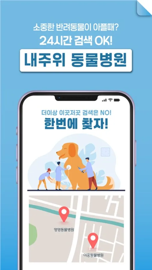 24시간 언제든 내 주위에 있는 동물병원 정보를 확인하여 혹시 모를 상황에 언제 어디서든 걱정 없이 반려동물 케어가 가능합니다.