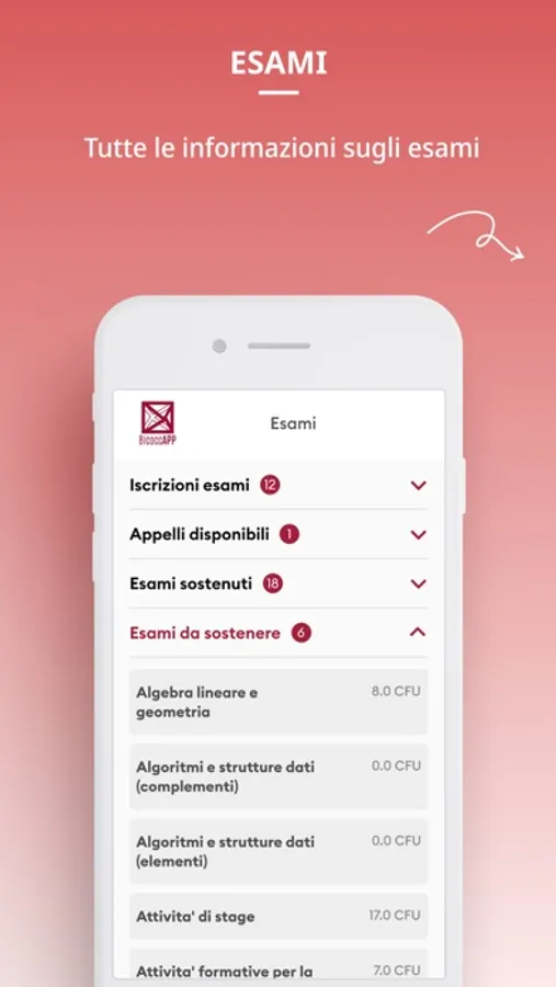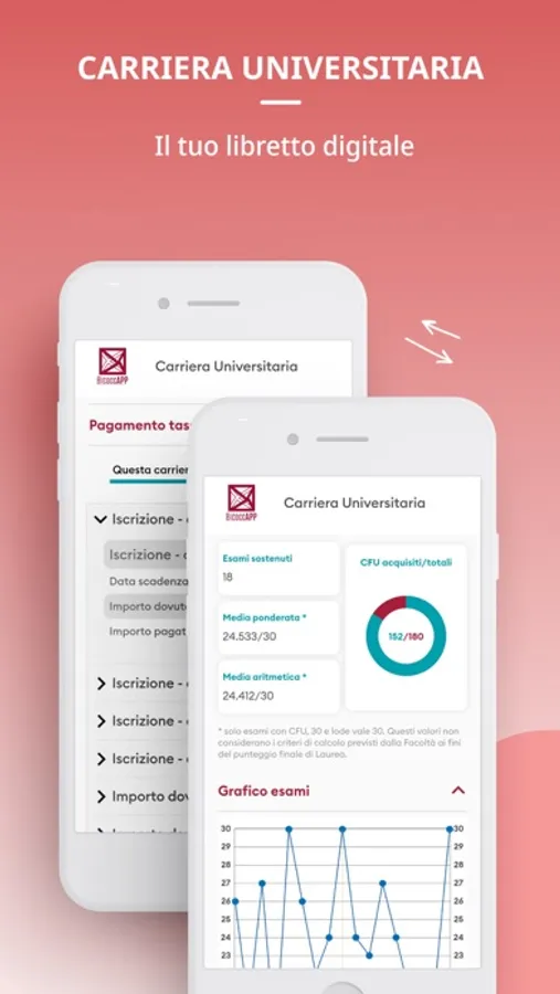 BicoccApp is the official application of the University of Milan-Bicocca designed to manage the university career quickly and easily, including the possibility to view results and progress of exams, the status of payments and other useful information pertaining to the student career.