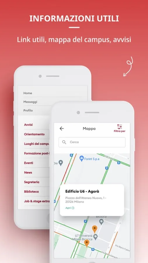 Enrolled students have full functionality in the app while those who have already completed their career will have a restricted view of their career booklet, which includes a list of exams/marks and all career information such as averages, trends and tuition status as well as all the useful links. These links are also available to prospective students, including information on orientation, postgraduate courses, library, university residences.