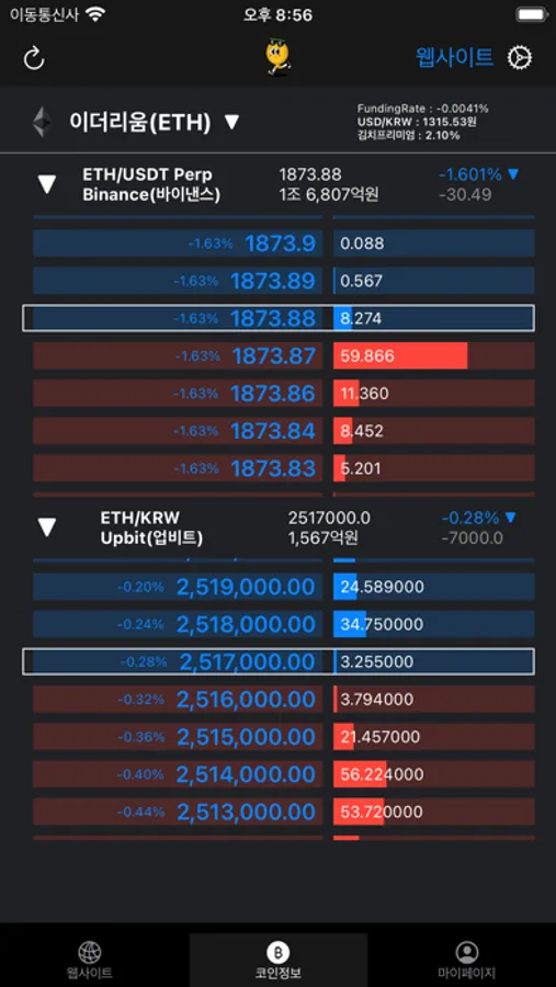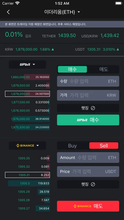 - 업비트 원화 ~ 바이낸스 현물/USDT선물 간 동시 상장 코인 종목에 대한 국내/해외 호가창, 김치프리미엄 정보를 한눈에 확인 가능