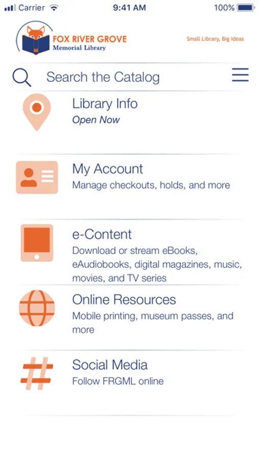 Fox River Grove Memorial Library at your fingertips, everywhere you go! Manage your account, search the catalog, place holds, check due dates, renew items, access digital content, and more with this mobile app.