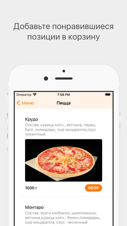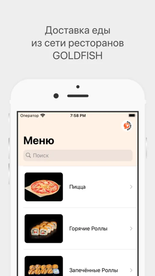 Как сделать заказ в приложении “GOLDFISH”: выберите понравившиеся позиции из меню, добавьте их в корзину и перейдите на экран оформления заказа (по нажатию на иконку корзины).