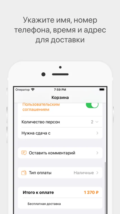 Укажите время, когда хотите прийти за своим заказом или выберите доставку с указанием времени и адреса доставки.