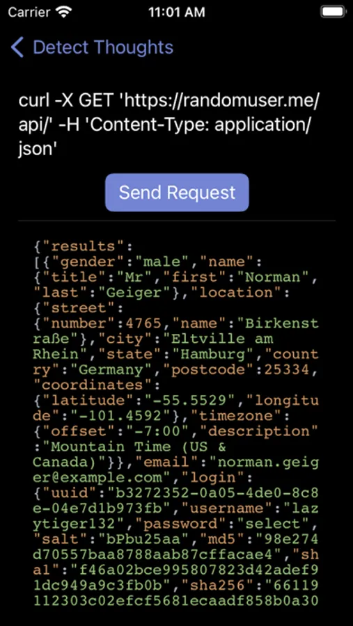 Detect Thoughts is simple to use. Just enter the endpoint, headers, parameters, auth if necessary, and click Submit to see what the actual curl command would be if sent through the Terminal and then submit to see a color-coded json response. This might be useful for developers who just want to provide a simple graphql type of endpoint for someone to see a simple output without building a whole page for it. There's also a history button so we can return to an endpoint over and over.
