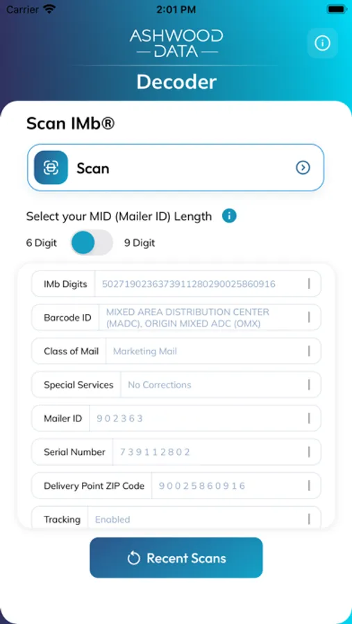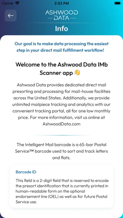 The IMb Scanner app is a free app that uses your device's camera to scan and convert USPS® Intelligent Mail Barcodes (IMb®). These barcodes are printed on mailpieces and aid the USPS® in delivering mail. The app decodes this information and provides you with a plain text breakdown of the IMb®.