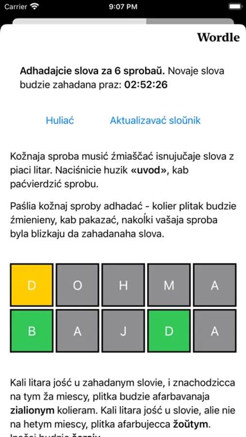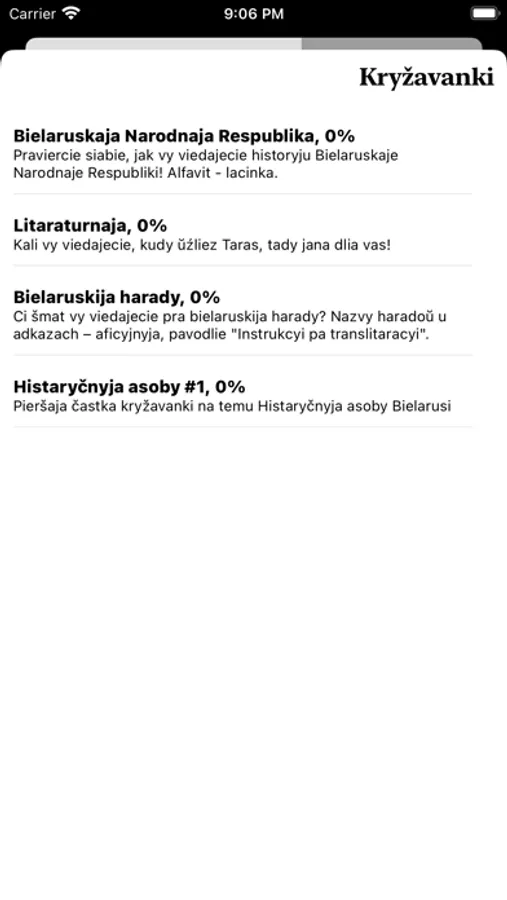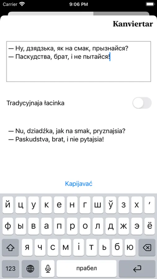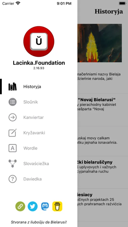 Bielaruskaja Lacinka is an application consisting of two modules, the main program and a keyboard module with specific Belarusian Latin characters with auto-complete words. Articles and news in Belarusian are about the history of Belarus, as well as the modern Belarusian Latin alphabet, crosswords and other word-oriented games.