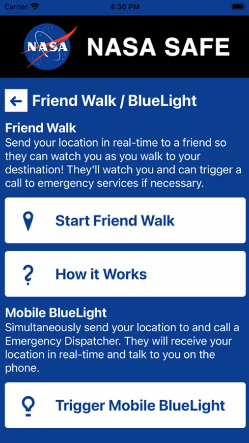- Mobile Bluelight: Send your location to NASA security in real-time in case of a crisis