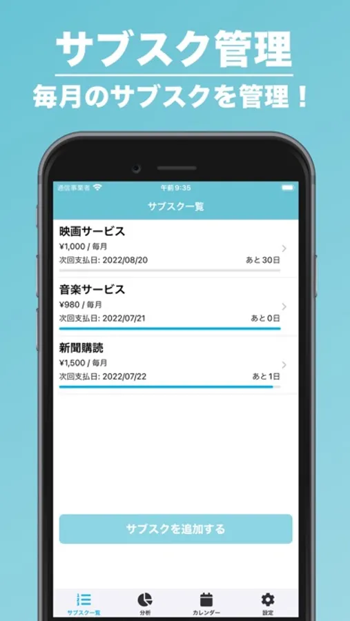 サブスク管理は、簡単に毎月のサブスクリプション(定期購入)を把握できるアプリです。かさみがちなサブスクの料金を登録して、節約に役立てましょう!