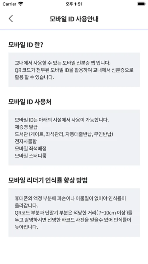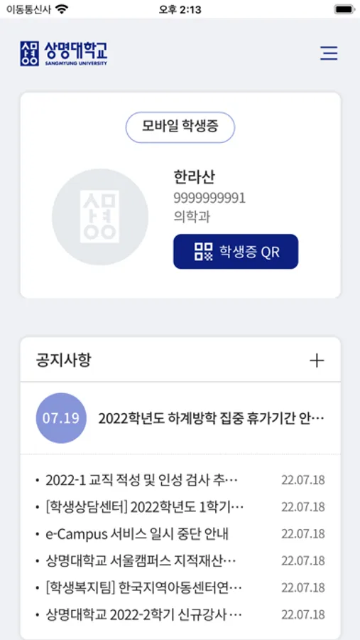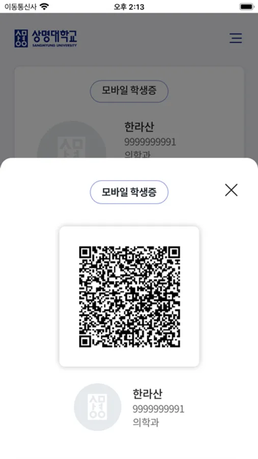 상명대학교 구성원의 모바일신분증으로 해당 앱을 활용하여 교내와 관련기관에서 학생증(또는 신분증)으로 활용할 수 있습니다.