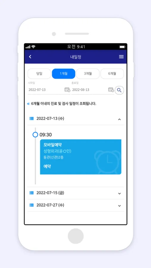 병원에서의 진료일정을 한번에 보실 수 있습니다.