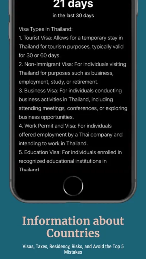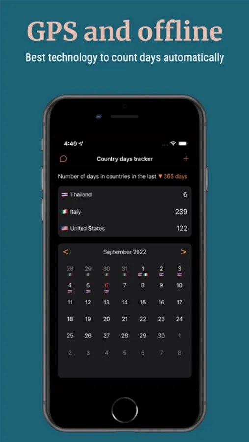 Travel smarter, not harder. With Country Days Tracker, you can easily keep track of your days spent in different countries without wasting time counting and calculating.