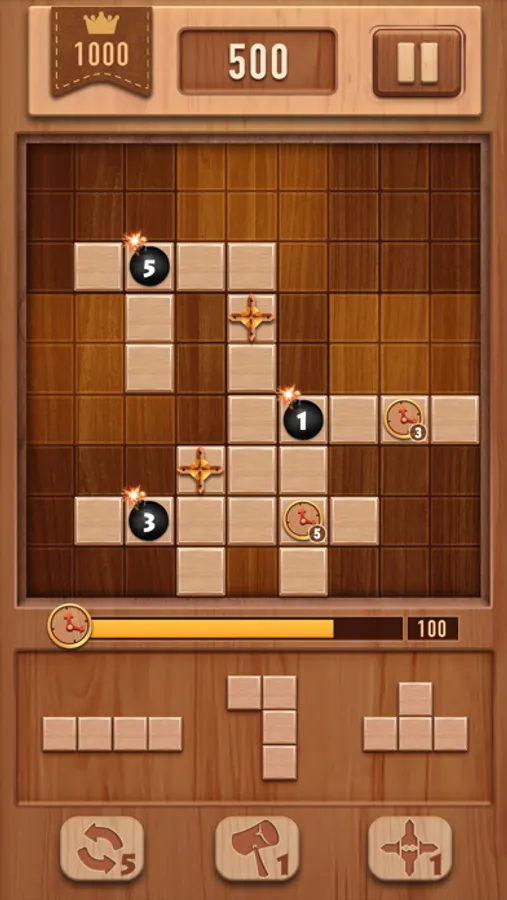 ● Try to fit them all in the row or column. Then the wood blocks will be clear and you get points. Game will be over if there are no room for any the shapes below the grid.