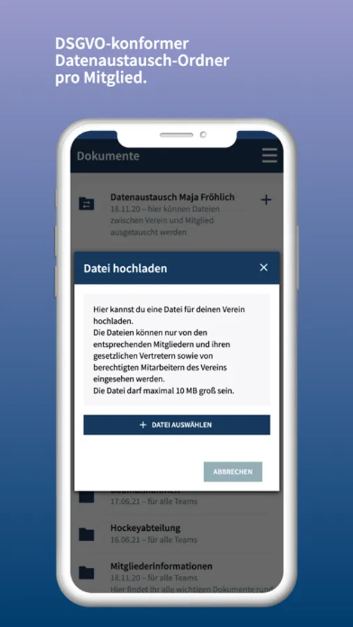 - Upload von Dokumenten: Fotografieren Sie wichtige Dokumente, wie z.B. Immatrikulationen oder Bescheinigungen und senden diese einfach und datenschutzkonform über die App an Ihre Mitgliederverwaltung.