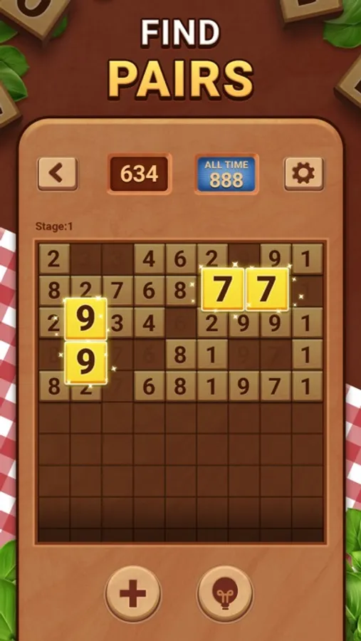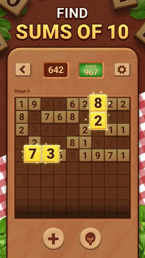 - Clear all digits from the wood grid by deleting pairs of equal digits (1 and 1, 6 and 6) or pairs of digits that add up to ten (6 and 4, 3 and 7)