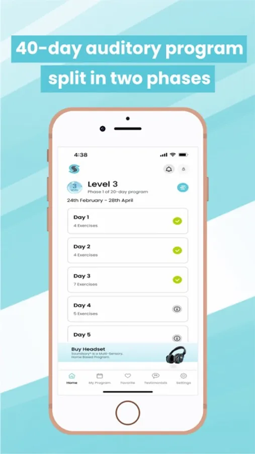 The Soundsory app offers a broad range of exercises that is specially catered to your physical profile. Each day has a set of exercises that are ideal for the level that will be assigned to you after you complete our questionnaire. Put on your Soundsory headset, start the music program and practice these exercises for 30 minutes a day for an initial 40 day period. You can take a period of rest and then continue with the program for another 40 days.