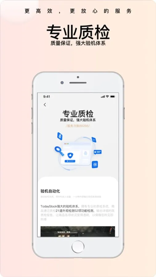 TodayStock拥有强大的验机体系,为平台交易的二手手机提供验机服务,推出适合B端流通的标准定级,严格把关送检商品质量。