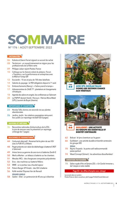 À chaque parution et où que vous soyez, feuilletez en ligne votre magazine Matériel et Paysage et accédez à ses contenus exclusivement réservés à nos abonnés (actualité de votre secteur, essais machines, comptes-rendus salons…)